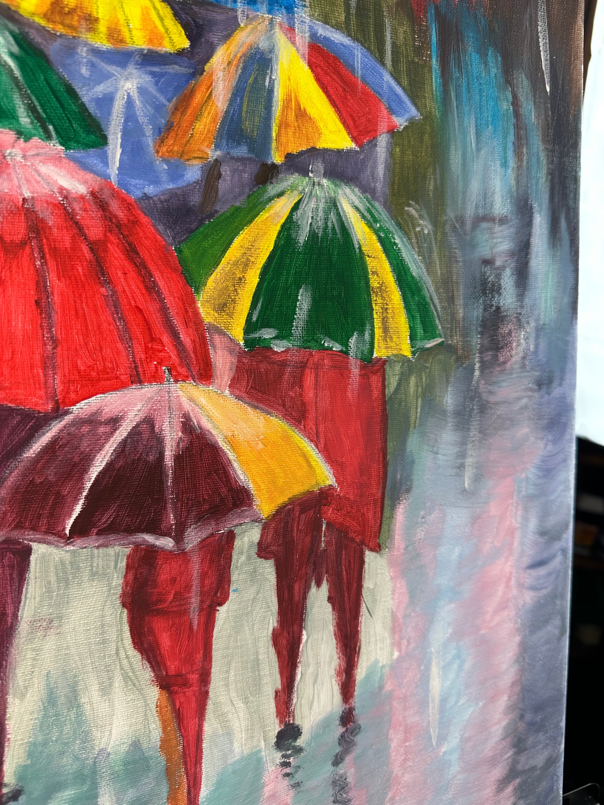 When I first moved to the UK, I wasn’t used to the constant rain. At first it felt heavy, then poetic. One afternoon I was walking through the city, soaked and tired, when I looked up and saw a wave of umbrellas — each one like a little world, bright and personal. I smiled and thought, “Okay, this is part of the beauty too.” That moment became this painting. It’s a reminder that even grey days have their own colour and magic.