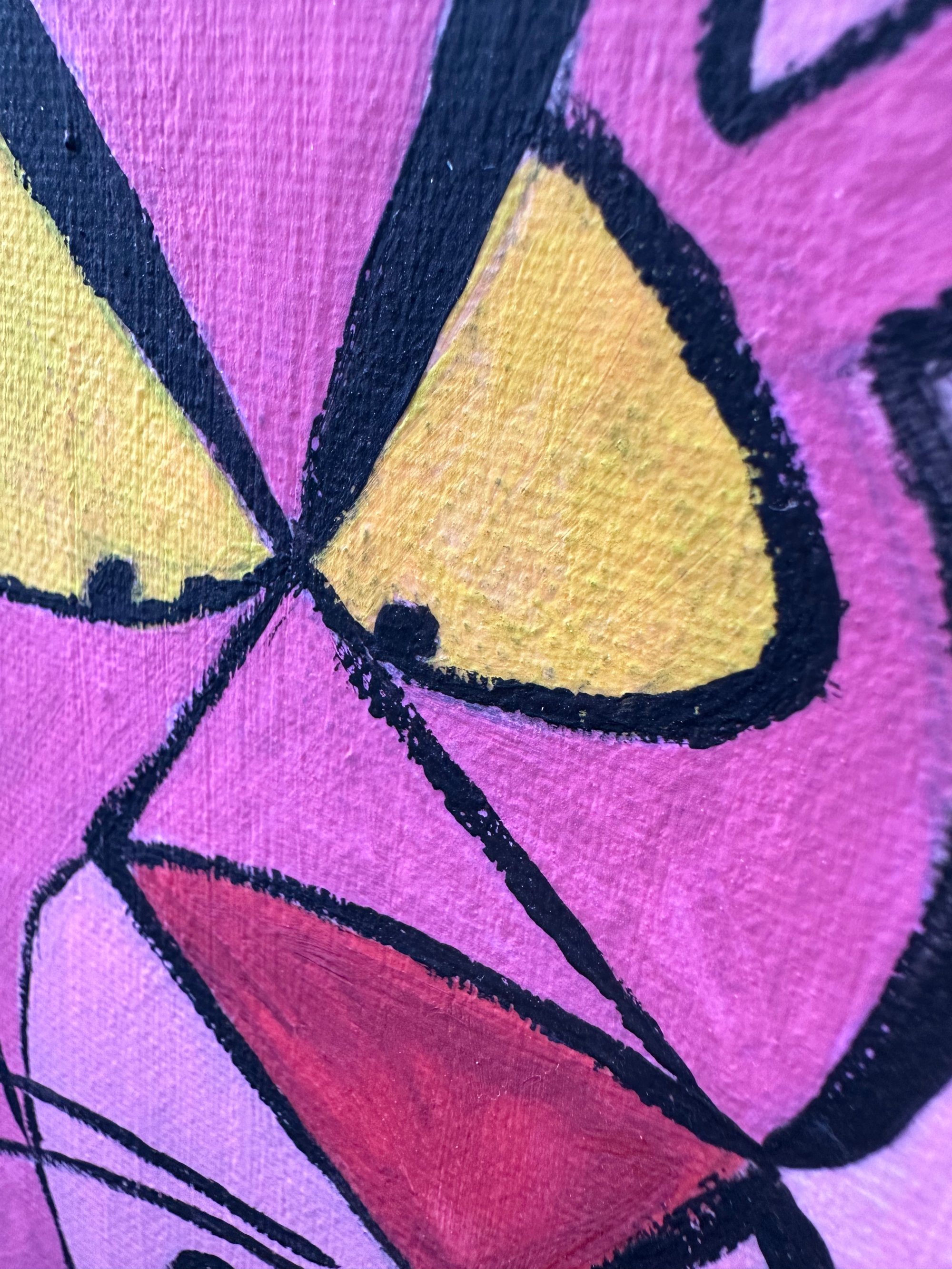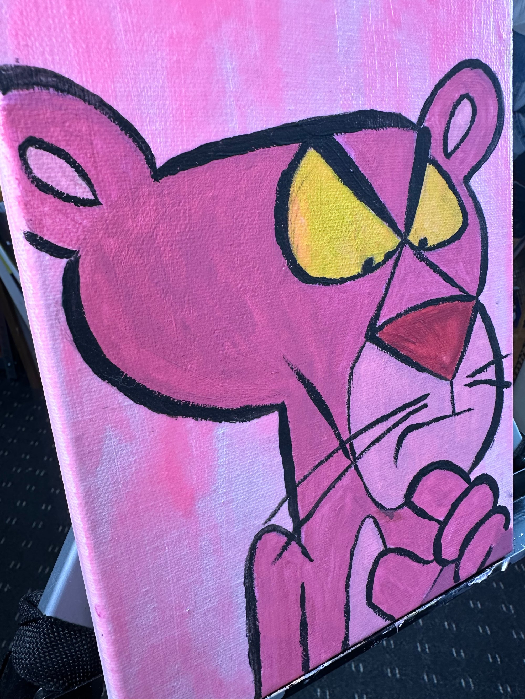 A fun, expressive twist on a pop culture icon — the Pink Panther caught mid-thought. With bold brush lines and rich pink gradients, this painting adds a dose of attitude and humor to any space. Small in size, big in personality.